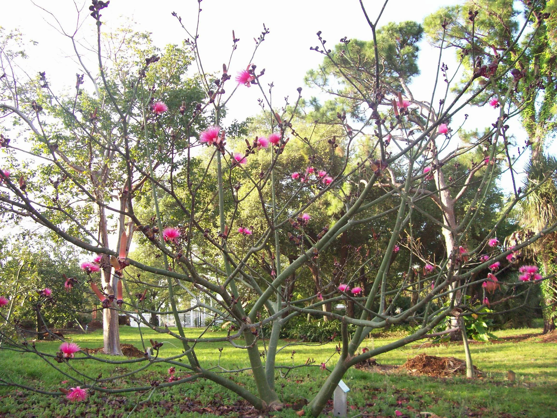 Included in this bevy of beautiful trees is a Powderpuff tree (Calliandra haematocephala, Bolivia), with cotton-candy pink blooms that never fail to dazzle.